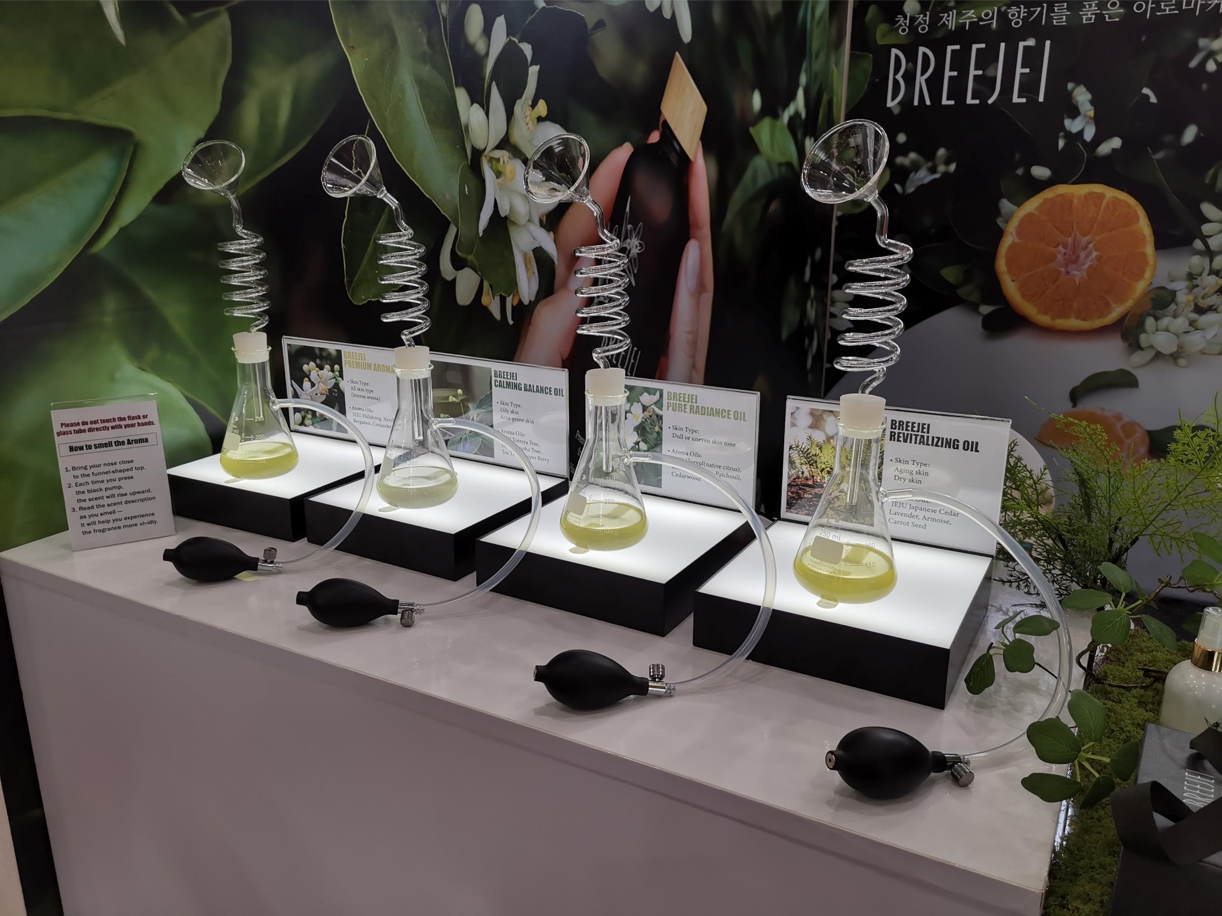 I also liked the fragrance testers at the Breejei booth: You stick your nose into the funnel-shaped bit and squeeze the bulb which releases a puff of fragrance through the funnel without the fragrance molecules spraying all over the place.