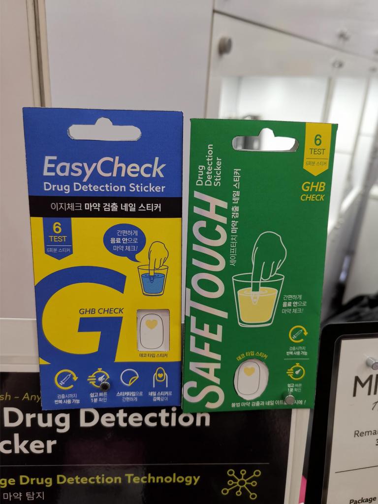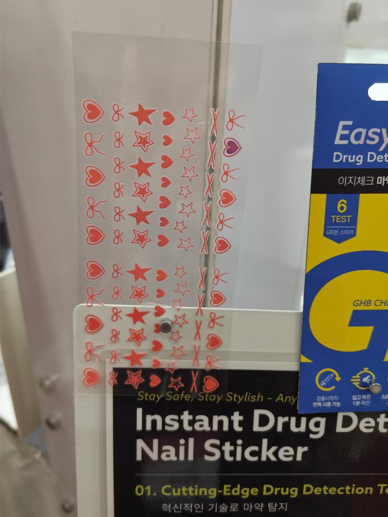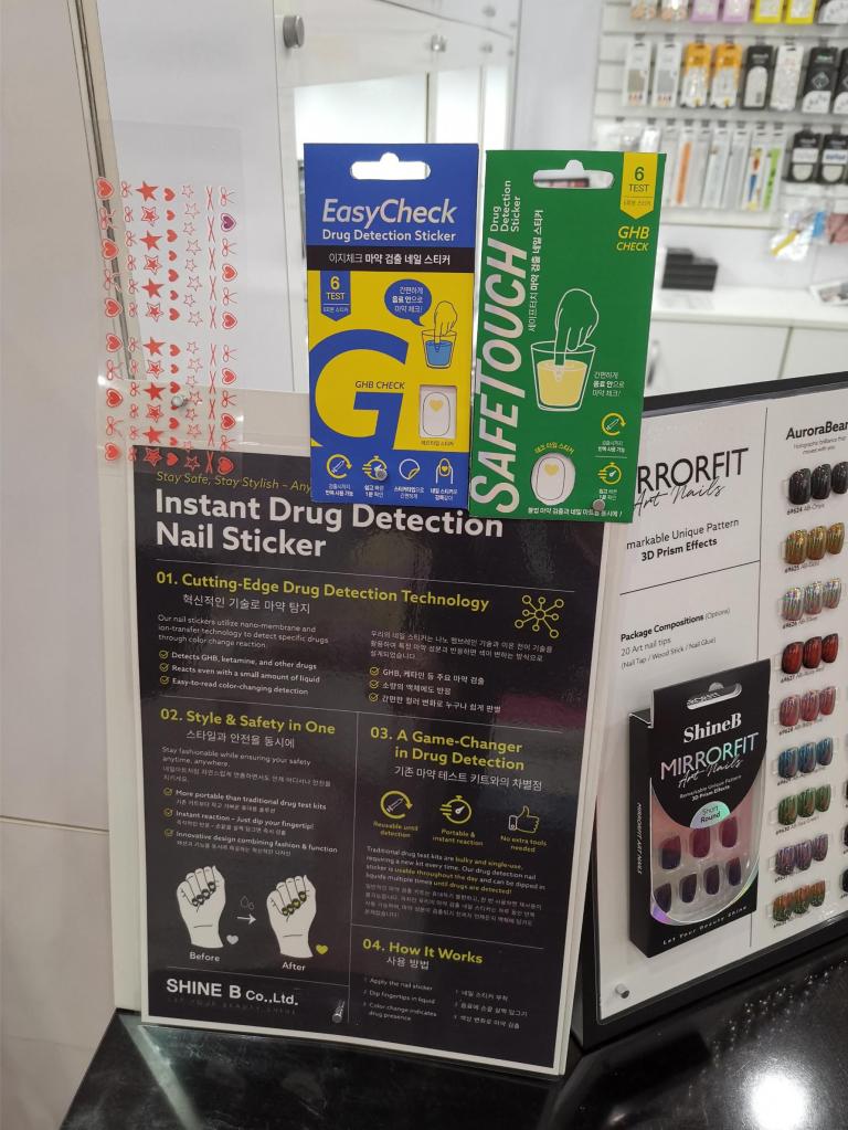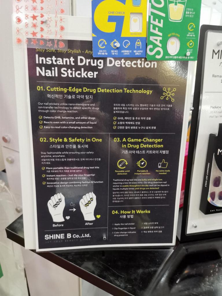 The nail stickers are applied to the finger nails, you can stick them on top of your usual manicure. If you want to test your beverage for drugs, you simply dip the nail into the liquid. If the sticker changes colour it indicates the presence of GHB (or whichever substance), i.e. someone tampered with your drink. According to packaging and marketing visuals, th drug detection stickers at the ShineB booth were designed to react to GHB, but the technology can easily be leveraged to encompass other type of drugs as well.