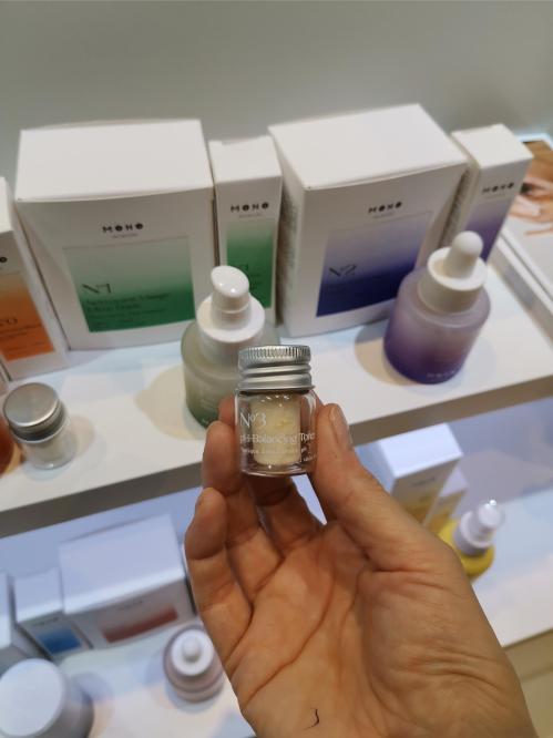 Mono Skincare was another La French Beauty exhibitor. The French indie brand launched in 2024 with an interesting refillable concept – the highly concentrated skin care actives and formulae are freeze-dried into a tablet shape. You then blend the tablet with drinking water to create the product. Each product set contains a large empty product container and a small glass bottle with the product tablet.