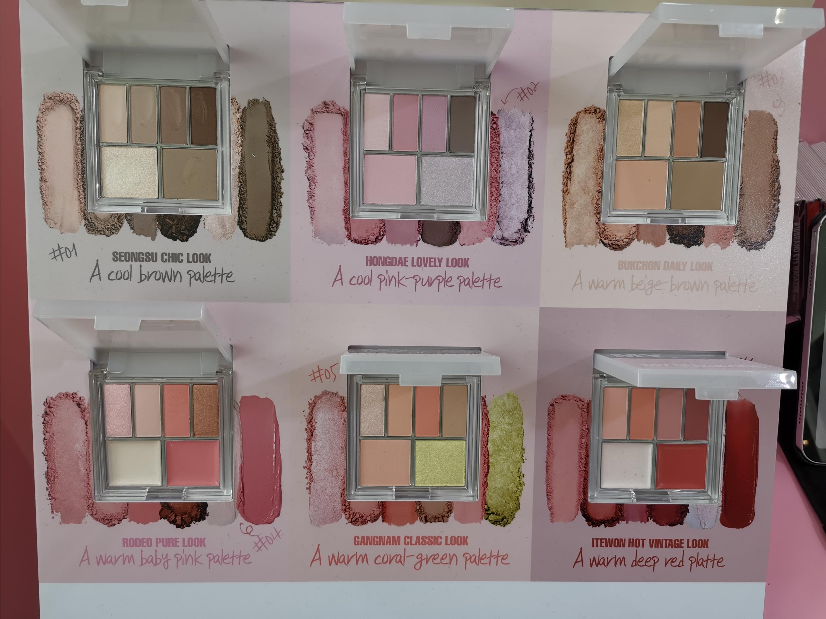 However, I must admit that I (now) prefer the new look: Six absolutely gorgeous eyeshadow/highlighter/blusher palettes which combines shimmer, glitter and balmy textures. Each palette is named after a trending neighbourhood in Seoul – Gangnam, for example, Seongsu or Hongdae. I tried out some of the colours on my hand and as you would expect from a Korean brand, the powders are super easy to blend and have great colour payoff.